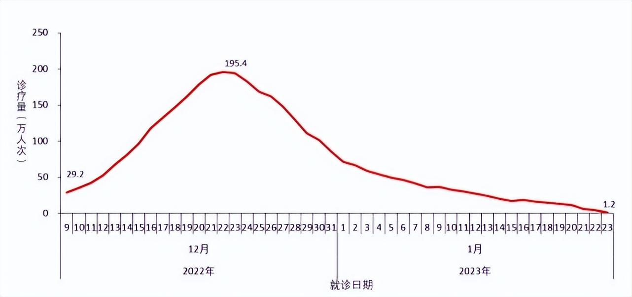 全国(不含港澳台)发热门诊(诊室)就诊人数于2022年12月23日达到峰值286.7万人次,随后连续下降,2023年1月23日下降到6.3万人次,较峰值下降了97.8%(图2-1)。