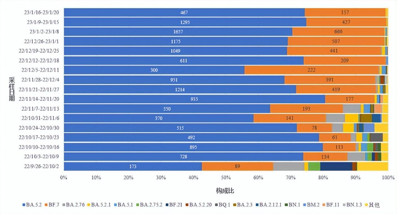 说明:1.采样时间:2022年12月1日-2023年1月20日。2.图中标记的数字分别为BA.5.2和BF.7进化分支有效基因组序列数量。